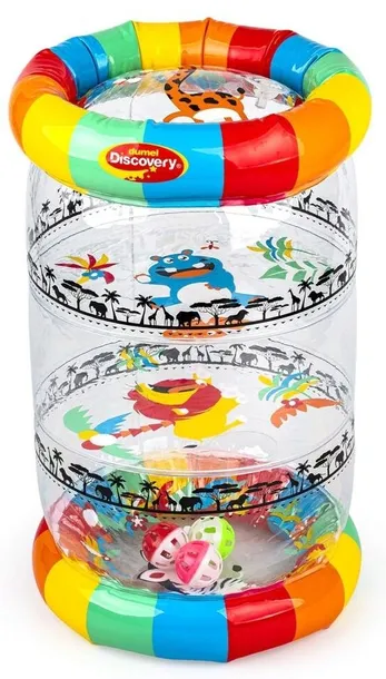 Kolorowa zabawa na wyciągnięcie rączki malucha! Ten pomysłowy roler posiada trzy zawory, umieszczone na poszczególnych segmentach, pozwalające na napełnienie go powietrzem, aby nabrał kształtu. Wewnątrz rolera znajdują się grzechoczące piłeczki, które przy potrząsaniu zabawką wydają wesoły dźwięk. Rolerem można bawić się na cztery różne sposoby, turlając go przed sobą i raczkując za nim, potrząsając nim i słuchając grzechocących piłeczek, ustawiając go pionowo i manewrując nim w taki sposób, aby piłeczki wpadły w otwory, a także zaglądając do środka przez przezroczyste ścianki i oglądając obrazki, zdobiące roler. Dzięki możliwości spuszczenia powietrza z zabawki, złożony na płasko roler zajmuje niewiele miejsca.Produkt przeznaczony jest dla dzieci od 6 miesiąca życia. Cechy produktu:- 4 sposoby na zabawę z Rolerem: 1) turlaj roler, raczkując za nim; 2) trzęś rolerem, aby słuchać grzechotania piłeczek; 3) ustaw roler pionowo i manewruj nim tak, aby piłki wpadały w otwory; 4) zajrzyj przez przezroczyste ścianki i oglądaj obrazki; - przygotowanie do zabawy - roler dmuchaj w następującej kolejności: dolna obręcz, środek, górna obręcz;- wysokość po nadmuchaniu - ok. 44 cm;- wiek: 6m+.