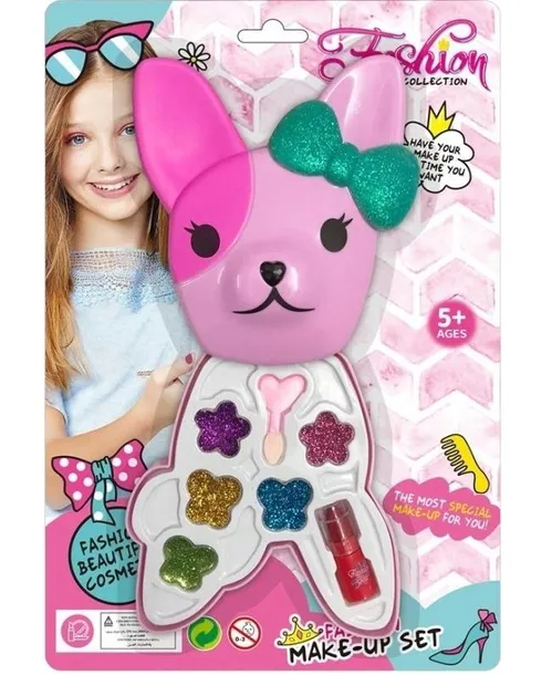 Rozbudź kreatywność swojej małej artystki z zestawem Fashion Make-Up Set! To fantastyczny zestaw kosmetyków dla dzieci, zapakowany w przyciągające wzrok opakowanie w kształcie uroczego, różowego pieska z kokardą. Piesek jest nie tylko pojemnikiem na kosmetyki, ale także wesołym elementem dekoracyjnym.W środku znajdują się bezpieczne i łatwe w aplikacji produkty do makijażu, stworzone specjalnie z myślą o delikatnej skórze dzieci. Paletka zawiera sześć błyszczących cieni do powiek w żywych kolorach: fioletowym, różowym, złotym, niebieskim, jasnej zieleni i czerwieni, które pozwalają na stworzenie niesamowitych, brokatowych stylizacji. Dodatkowo w zestawie znajduje się mały aplikator w kształcie serca oraz buteleczka czerwonego lakieru do paznokci, który można zmyć wodą.Zestaw jest polecany dla dzieci w wieku 5 lat i starszych, zgodnie z oznaczeniem 5+ ages na opakowaniu. To idealna zabawka wspierająca rozwój wyobraźni, zdolności manualnych i odgrywanie ról. Dzięki niemu każda mała dziewczynka może poczuć się jak prawdziwa wizażystka. To specjalny makijaż dla Ciebie, jak głosi hasło na opakowaniu.