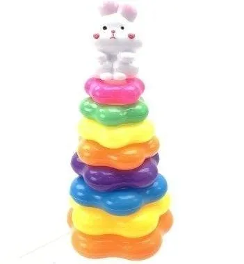 Odkryj radość z układania z naszą tęczową piramidą, która stanie się ulubionym towarzyszem codziennych zabaw Twojego dziecka. Ta wyjątkowa wieża to znacznie więcej niż zwykłe klocki - to fascynująca podróż przez świat kolorów i kształtów, która od pierwszych chwil angażuje uwagę malucha. Miękkie linie i pofalowane krawędzie obręczy sprawiają, że ich chwytanie jest niezwykle łatwe, co pozwala dziecku na swobodne ćwiczenie sprawności manualnej oraz precyzji ruchów.Zabawa polega na nakładaniu kolejnych elementów na pałąk, co w naturalny sposób uczy dziecko porządkowania, kategoryzowania i zrozumienia pojęcia wielkości. Żywe, nasycone barwy stymulują zmysł wzroku, a różnorodna tekstura poszczególnych pierścieni zachęca do odkrywania zabawki dotykiem. Ukoronowaniem całej konstrukcji jest przesłodka figurka białego króliczka z różowymi policzkami, która motywuje dziecko do dokończenia budowli i nadaje zabawce wyjątkowego, przytulnego charakteru.Dzięki starannemu wykonaniu z bezpiecznych materiałów piramida jest trwała i odporna na dziecięce eksperymenty. Estetyczne wykończenie sprawia, że wieża pięknie prezentuje się na półce w pokoju dziecięcym, będąc jednocześnie zabawką, która nigdy się nie nudzi. To doskonały sposób na wspieranie rozwoju poznawczego i kreatywności w atmosferze pełnej radości i kolorów.