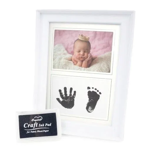 plastikowa ramka na zdjęcia, rozmiar ramki 15,5 x 20,6 cm, szerokość listwy 2 cm, do postawienia lub powieszenia, zawiera poduszkę z tuszem do wykonania odcisku dłoni lub stopy dziecka