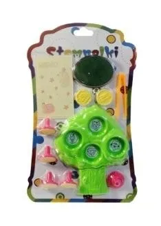 Kolorowy zestaw stempelków wraz z gąbeczką, kartkami i pęsetą i drzewkiem gdzie można odłożyć stempelki aby się nie zgubiły. Stempelki z motywem jedzenia i zwierzątkami. Zestaw pozwoli stworzyć dzieciom unikalne prace. Podane wymiary stanowią wymiar opakowania. Produkt zapakowany w kartonową podstawkę z przezroczystym kloszem.